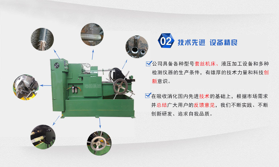 本套絲設(shè)備屬于無(wú)削加工設(shè)備,運(yùn)用特殊的切削技術(shù),上絲輕盈快捷,提高生產(chǎn)效率,采用三點(diǎn)一線,同心度高,性能穩(wěn)定等優(yōu)點(diǎn),本機(jī)每分鐘可切削3-5根工件,速度快,效率高,對(duì)于一些不定長(zhǎng)度的鋼結(jié)構(gòu)公司,橋梁工程,電力設(shè)施等大企業(yè)的批量生產(chǎn)之需要。